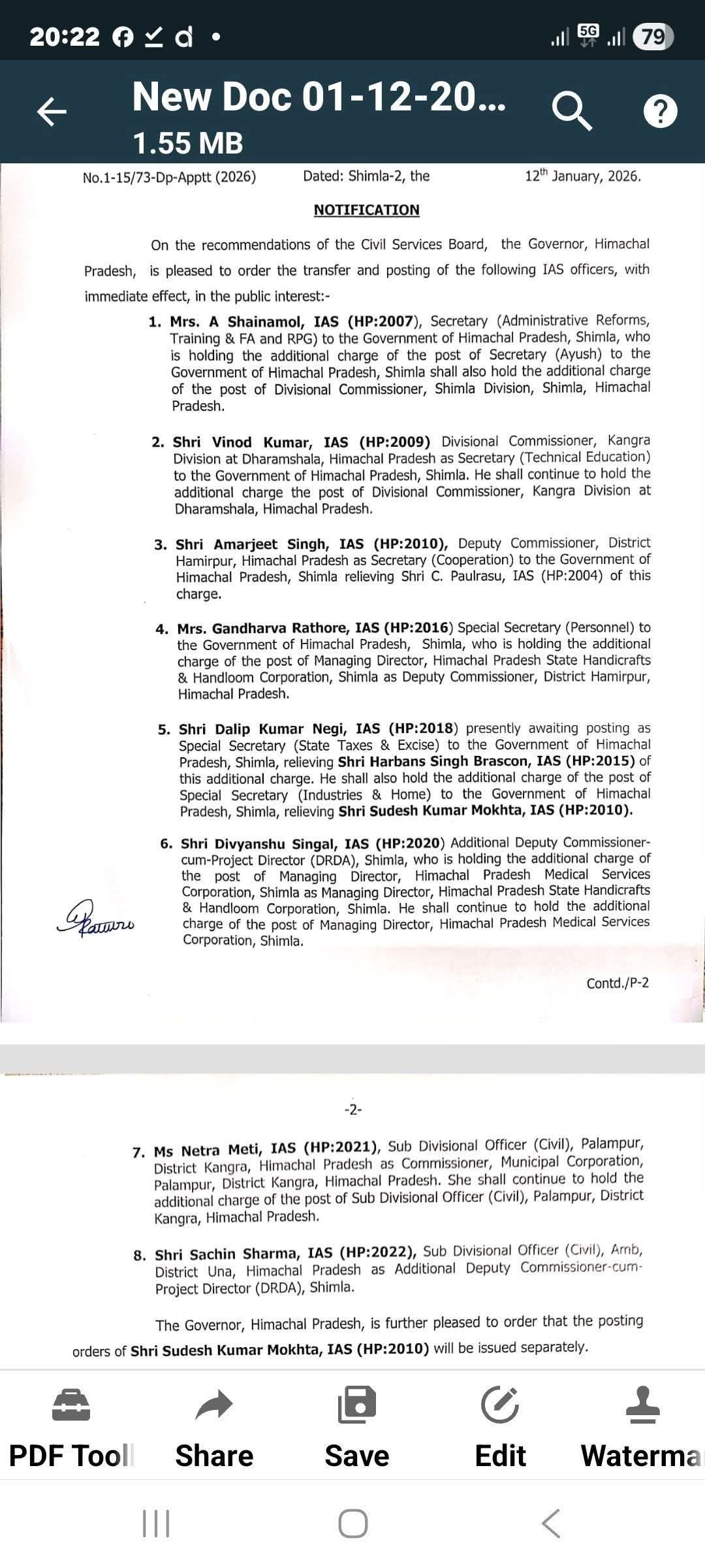 Trending Now आज का राशिफल 13 जनवरी 2026: जानिए सभी 12 राशियों का सटीक भविष्य 5 HAS अफसरों के तबादले/अतिरिक्त कार्यभार 8 IAS अफसरों को नई तैनाती डीसी हमीरपुर भी बदले विशेष गहन मतदाता सूची पुनरीक्षण लोकतंत्र की शुचिता के लिए अनिवार्य कांग्रेस राज में अपराधियों का राज, पुलिस पर भीड़ के हमले से कानून व्यवस्था ध्वस्त : भाजपा मुख्यमंत्री–मुख्य सचिव कार्यालय निर्माण में भारी भ्रष्टाचार उजागर जल शक्ति विभाग में 36.77 करोड़ का पाइप घोटाला उजागर, कांग्रेस सरकार मौन क्यों? : संदीपनी भारद्वाज हिमाचल के धनंजय चांटा ने वैश्विक मंच पर रचा इतिहास, वडोदरा वर्ल्ड टेबल टेनिस यूथ प्रतियोगिता में टॉप–32 में बनाई जगह मुख्यमंत्री ने ऊर्जा परियोजनाओं की समीक्षा की, बांधों के वाष्पीकरण और ग्लेशियर पिघलने पर वैज्ञानिक अध्ययन के निर्देश कांग्रेस का किला ध्वस्त, पालमपुर में भाजपा का परचम लहराया Homehimachal8 IAS अफसरों को नई तैनाती डीसी हमीरपुर भी बदले himachal 8 IAS अफसरों को नई तैनाती डीसी हमीरपुर भी बदले By Rama Thakur January 12, 2026 FacebookTwitterPinterestWhatsApp 8 IAS अफसरों को नई तैनाती डीसी हमीरपुर भी बदले Tags#cmo#sukhvinder singh sukkhu #congress #himachal#shimla FacebookTwitterPinterestWhatsApp Previous articleविशेष गहन मतदाता सूची पुनरीक्षण लोकतंत्र की शुचिता के लिए अनिवार्यNext article5 HAS अफसरों के तबादले/अतिरिक्त कार्यभार Rama Thakurhttp://tazakhabar.in/ RELATED ARTICLES himachal 5 HAS अफसरों के तबादले/अतिरिक्त कार्यभार Rama Thakur - January 12, 2026 himachal मुख्यमंत्री ने ऊर्जा परियोजनाओं की समीक्षा की, बांधों के वाष्पीकरण और ग्लेशियर पिघलने पर वैज्ञानिक अध्ययन के निर्देश Rama Thakur - January 12, 2026 himachal कांग्रेस की नौटंकी केवल हाईकमान को खुश करने के लिए, ‘जी-राम-जी’ में हिमाचल को मिलता रहेगा 90:10 में केंद्रीय अनुदान : जयराम ठाकुर Rama Thakur - January 12, 2026 Search हिमाचल3054शिमला2619कुल्लू1200राजनीति953himachal904सोलन767shimla659मंडी377लाइफस्टाइल369क्राइम345कांगड़ा320शिक्षा278हमीरपुर275स्वास्थ्य268चुनाव257 Most Popular आज का राशिफल 13 जनवरी 2026: जानिए सभी 12 राशियों का सटीक भविष्य January 13, 2026 5 HAS अफसरों के तबादले/अतिरिक्त कार्यभार January 12, 2026 विशेष गहन मतदाता सूची पुनरीक्षण लोकतंत्र की शुचिता के लिए अनिवार्य January 12, 2026 कांग्रेस राज में अपराधियों का राज, पुलिस पर भीड़ के हमले से कानून व्यवस्था ध्वस्त : भाजपा January 12, 2026 Load more
