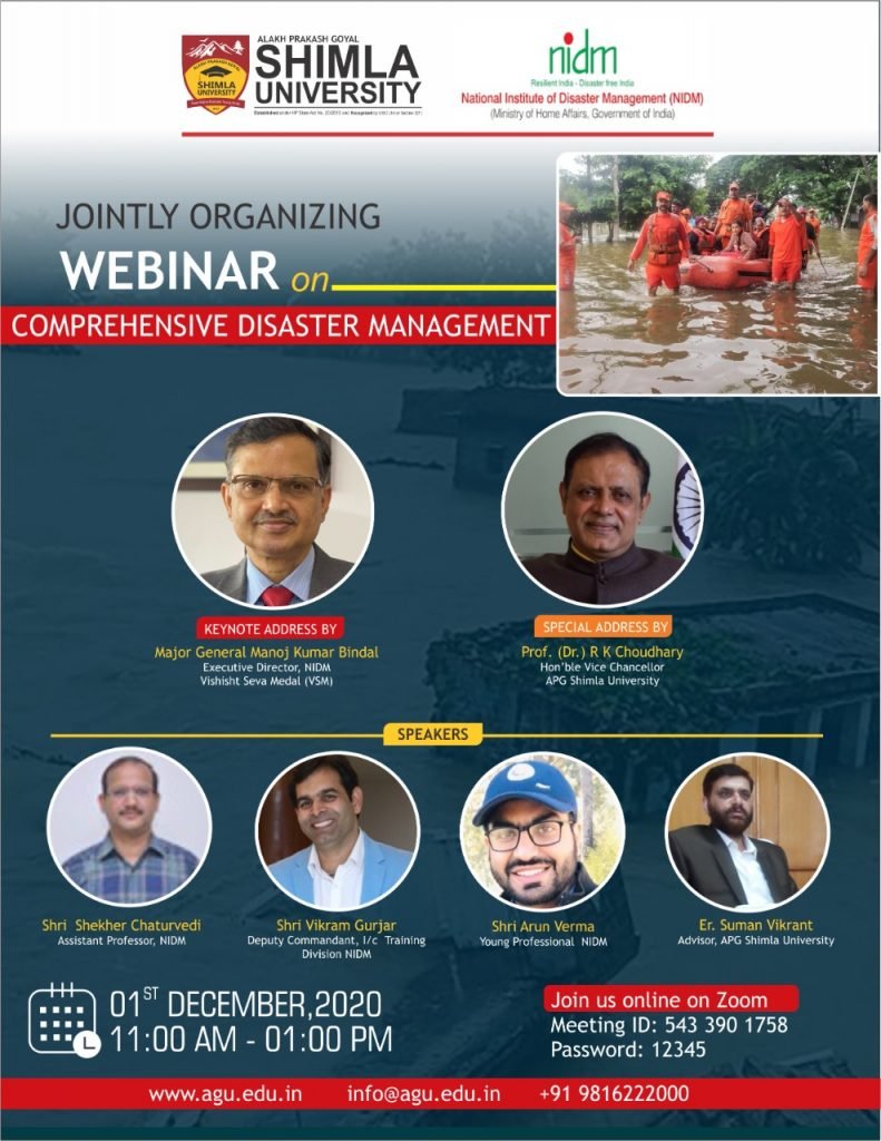 शिमला : कुदरती आफतों के कारण सभी कुछ तबाह हो जाता है। देश के विकास के लिए किए गए सभी प्रयास खत्म हो जाते हैं और विकास के पक्ष सेदेश पीछे चले जाते हैं। इन सभी आपदाओं के पहलुओं और इनके प्रबंधन पर भारत सरकार का गृह मंत्रालय का राष्ट्रीय आपदा प्रबंधन संस्थान और स्थानीय एपीजीशिमलाविश्वविद्यालय एक साथ मिलकर एक दिसंबर को व्यापक आपदा प्रबंधन विषय पर एक दिवसीय ऑनलाइन वेबिनार ग्यारह बजे सुबहआयोजितकरनेजारहेहैं।एपीजीशिमलाविश्वविद्यालयकेसलाहकारइंजीनियरसुमनविक्रांतनेबतायाकिराष्ट्रीयआपदाप्रबंधनसंस्थानऔरएपीजीशिमलाविश्वविद्यालयकेबीचआपदाप्रबंधनवआपदाओंकेप्रतिलोगोंकोजागरूककरनेकेलिएटाई-अपवएमओयूहुआहै।विश्वविद्यालयसलाहकारसुमनविक्रांतनेविद्यार्थियोंसहितलोगोंसे आ ग्रह किया है कि इस वेबिनारमें हिस्सा ले कर आपदा प्रबंधन के बारे में विषयविशेषज्ञों द्वारा सुजाये जाने वाले आपदा-प्रबंधनव आपदा से बचाव बारे उनके विचारसुनें।इस वेबिनार का आयोजन एपीजी शिमला विश्वविद्यालय के स्कूल ऑफटेक्नोलॉजी एवं साइंसेज की ओर से डॉ.आनदमोहन की अगुवाई में करवाया जा रहा है। वेबिनार में राष्ट्रीय आपदाप्रबंधन संस्थान के कार्यकारी निदेशक मेजर जनरल बिंदल(विशिष्ट सेवा मैडल), एपीजी शिमला विश्वविद्यालय के कुलपति प्रो.डॉ. रमेश कुमार चौधरी, राष्ट्रीय आपदा प्रबंधन संस्थान में कार्यरत सहायक आचार्य शेखरचतुर्वेदी, विक्रम गुर्जर डिप्टी कमांडेंट ट्रेनिंग डिवीज़न, अरुण वर्मा आपदा प्रबंधन विशेषज्ञ मुख्यवक्ता के रूप में विद्यार्थियों और लोगों को आपदा प्रबंधन को ले कर विशेष व्याख्यान देंगें।इसके अलावा वेबिनार में एपीजी शिमला विश्वविद्यालय के सलाहकार इंजीनियर सुमन विक्रांत आपदा प्रबंधन पर अपनेविचार सांझा करेंगें।
