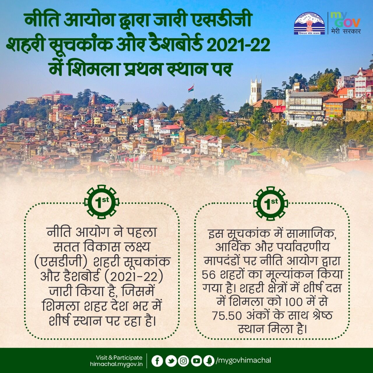इस उपलब्धि पर प्रदेश के लोगों को बधाई देते हुए जय राम ठाकुर ने कहा कि भारत सरकार के नीति आयोग ने देश के 56 शहरों को इसमें शामिल किया था, जिनमें 10 लाख से अधिक आबादी वाले 44 शहर और 10 लाख से कम आबादी वाली 12 राज्यों की राजधानियां शामिल थीं। उन्होंने कहा कि यह सूची गरीबी, स्वास्थ्य, शिक्षा, लैंगिक समानता, सस्ती और सुलभ ऊर्जा और जलवायु जैसे मापदण्डों के तहत शहरों के प्रदर्शन को ध्यान में रख कर तैयार की गई है। उन्होंने कहा कि इस सूची के मूल्यांकन के लिए 46 लक्ष्य और 77 संकेतक निर्धारित किए गए थे और शिमला शहर को 100 में से 75.50 अंकों के साथ सर्वश्रेष्ठ स्थान प्राप्त हुआ है।