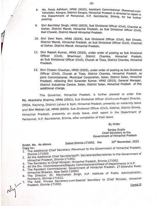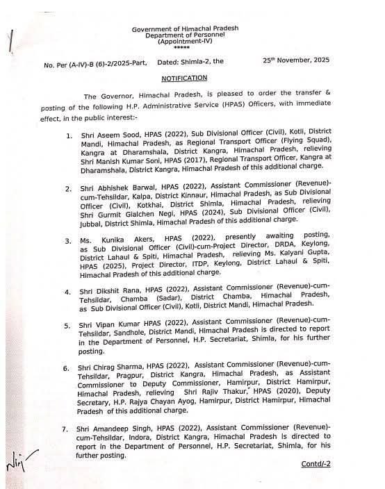 HomeshimlaTransfer : प्रशासनिक अधिकारीयों के तबादला आदेश